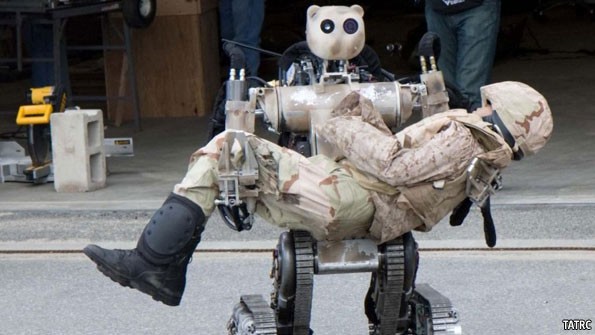 The Battlefield Extraction-Assist Robot, BEAR for short, is, in the words of Gary Gilbert of the American Army’s Telemedicine and Advanced Technology Research Centre (TATRC), “a highly agile and powerful mobile robot capable of lifting and carrying a combat casualty from a hazardous area across uneven terrain.” On top of that, when it is not saving lives, it can perform difficult, heavy and repetitive tasks, such as the loading and unloading of ammunition.