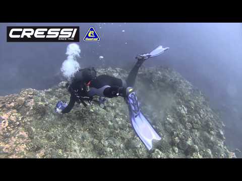 The Frog Plus utilizes Cressi's patented three material injection molding process. The three materials consist of a nice comfortable rubber on the foot pocket that extends up the side rails of the blade. The second material is the revolutionary new dual density techno polymer which forms the blade, and in conjunction with the third silicone based material creates a channeling effect. The channeling effect is the characteristic of the fin that enables a high level of energy to be transferred in both up and down strokes of the kick pattern. The Frog Plus also incorporates Cressi's patented positioning of the foot pocket below the blade. This design increases the working surface area of the blade by 20%. The combination of the channeling effect and the foot pocket mounted beneath the blade creates a very powerful and efficient fin with minimal leg strain.Our thanks to Adam & James at Submerge who are the UK & Ireland agents for Cressi, for sending us the pair to review.For more information on this and other products from Cressi please visit http://www.cressi.it