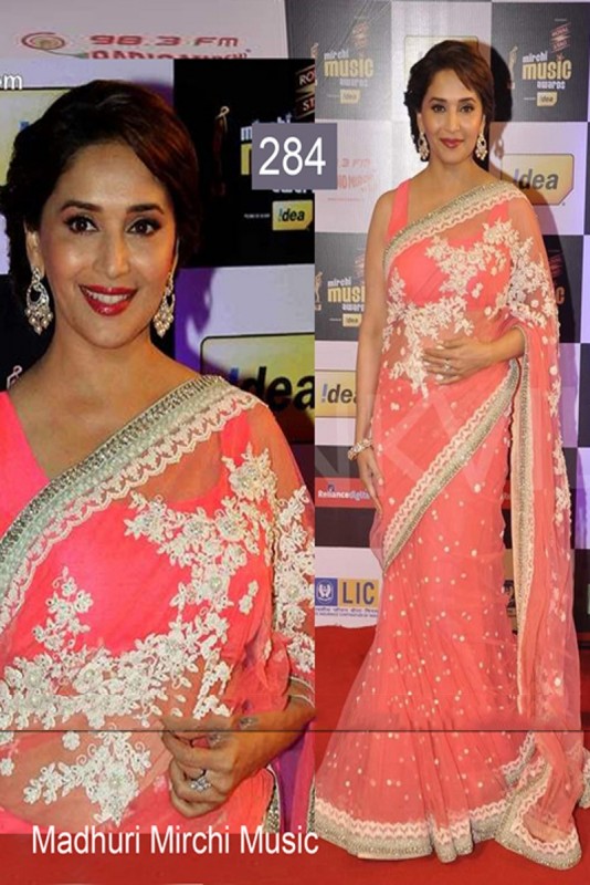 Madhuri Dixit looks gorgeous in whatever she wears. But this pink net saree brings out her grace to the utmost. The shade of pink is sure to woo the hearts of many women. On top of that the white thread work and border work is too endearing to miss out. This is a perfect option for parties when teamed up with a pink sleeveless blouse. Net saree and sleevelees blouse is almost an unstated rule for party look.