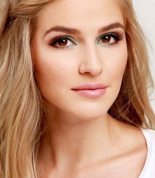 - Use the same mint green shade and gently apply it to the lower down of the lash line with a small angle brush.
